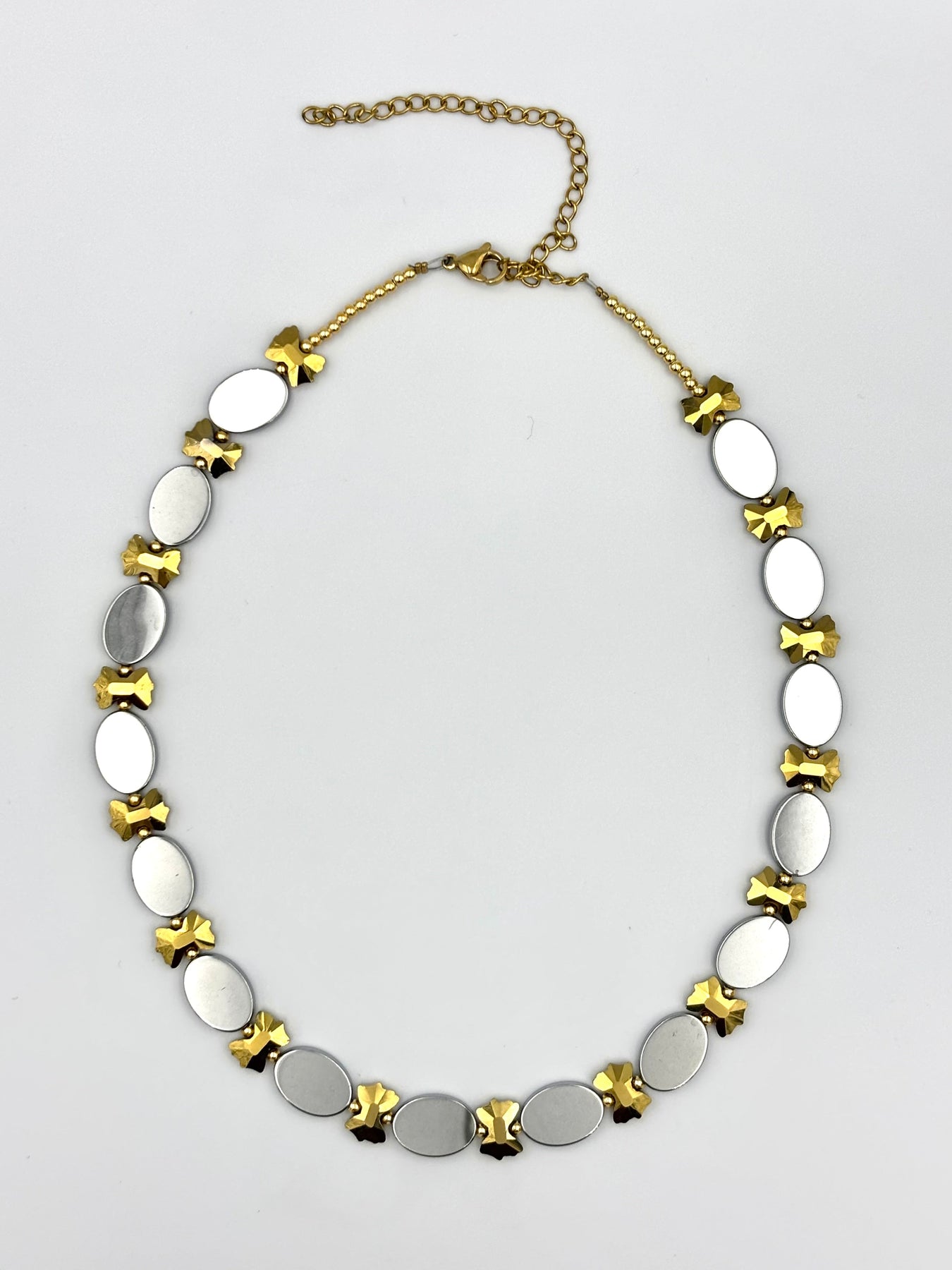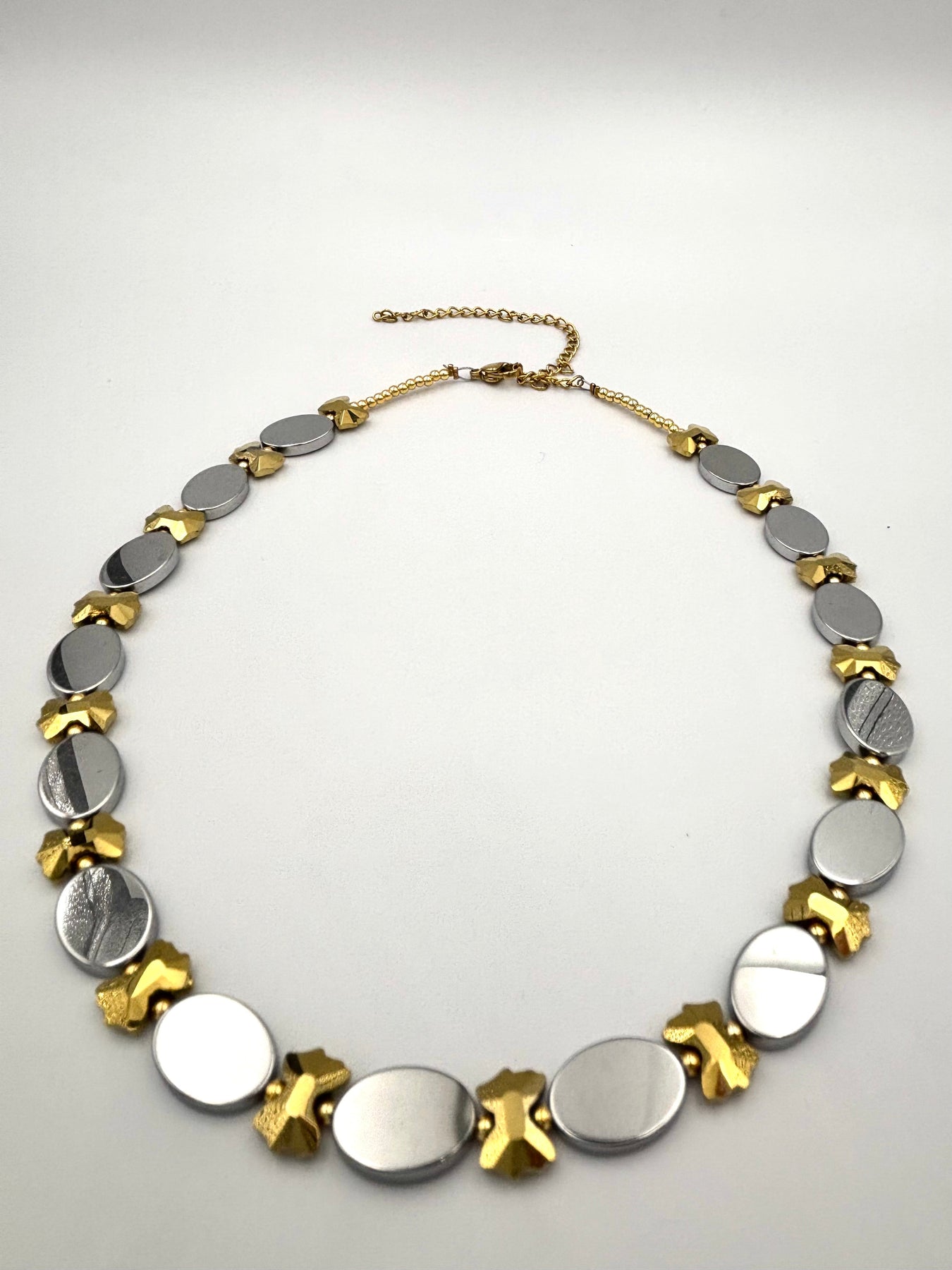 Κολιέ Χάρις με Χρυσή Αλυσίδα και Ατσάλινα Ασημί Στοιχεία με Χρυσές Λεπτομέρειες, ένα κομψό κόσμημα που συνδυάζει τη σύγχρονη αισθητική με τη διαχρονική λάμψη. Ο μοναδικός συνδυασμός χρυσού και ασημί το καθιστά ευέλικτο, ιδανικό για κάθε στυλ και περίσταση, από καθημερινές εμφανίσεις έως πιο ιδιαίτερες στιγμές. Ανθεκτικό, καλαίσθητο και ελαφρύ, μπορεί να φορεθεί μόνο του ή σε layering με άλλα κολιέ. Το Κολιέ Χάρις είναι ιδανική επιλογή για γυναίκες που αγαπούν τα μοντέρνα, μίνιμαλ κοσμήματα και την κομψότητα στις λεπτομέρειες, αποτελώντας ταυτόχρονα μια υπέροχη ιδέα δώρου.
